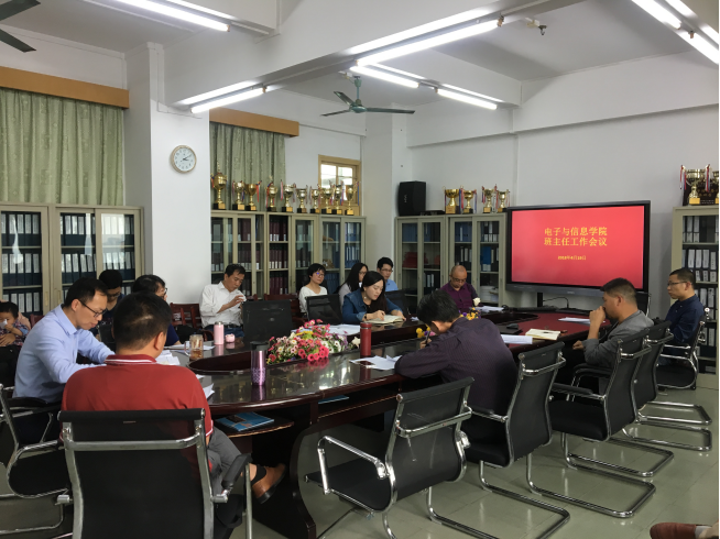 会上,辅导员韩琼对2018届毕业生的就业情况作了汇报,希望班主任更多深入学生班级,了解毕业班同学的所思所想,为毕业班同学的就业排忧解难;辅导员吴琼对家庭经济困难和心理健康存在隐患的学生情况作了汇报,并积极与班主任沟通交流,强调对特殊学生的关爱。罗旭辉书记结合《广东技术师范学院加强和改进思想政治工作三年行动计划》和电信学院实际情况,对2018年度的学生工作计划进行阐释,强调班主任工作要做到“五个一”,认真履行班主任职责,引导学生健康成长,帮助学生顺利完成学业。