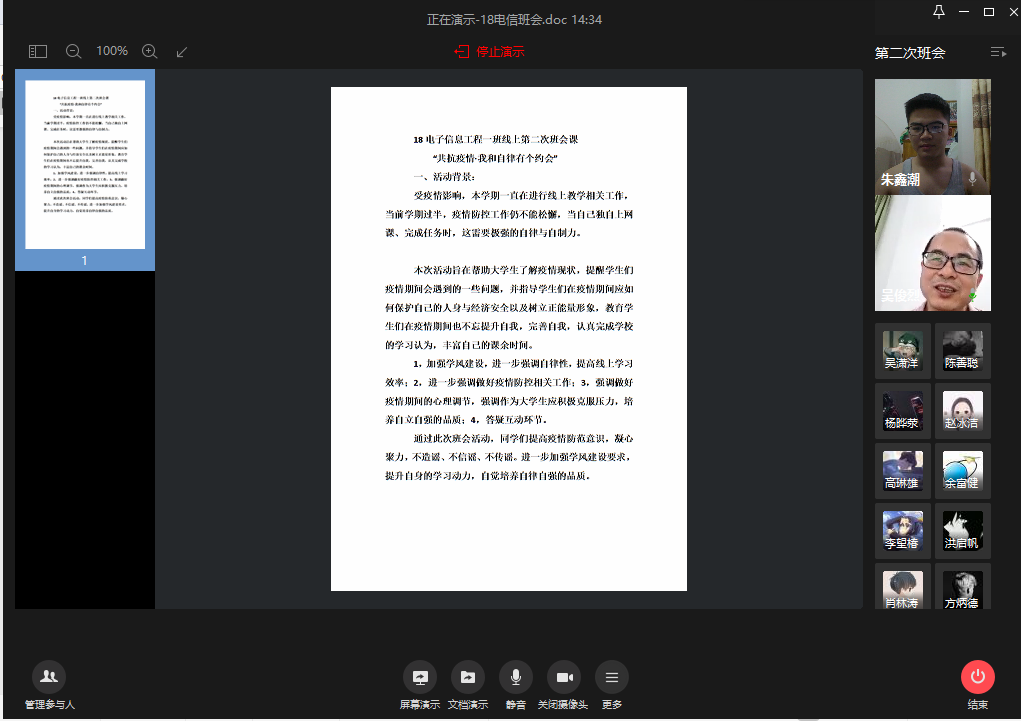 主题班会上,taptap点点体育班子成员深入各班线上坐“诊”,充分听取各班学生的意见和建议,并对相关问题给出解决方案,做到学生意见反映有渠道,有研究,有反馈。辅导员和班主任再次强调了疫情期间的纪律,同时结合教学计划、考试安排,要求同学们进一步提高学习自律性和线上学习效率,做好期末考试复习工作和诚信应考工作。在毕业班班会上,着重强调就业精准帮扶的措施,勉励毕业生积极参加“大学生征兵”“三支一扶”等基层就业项目,转变就业观念,主动就业。各班心理委员精心策划了心理健康教育的环节,分享了疫情期间心理调节的技巧,开展了关于生命教育的讨论,要求同学们保持乐观积极的心态,加强锻炼,保持身体和心理的健康。