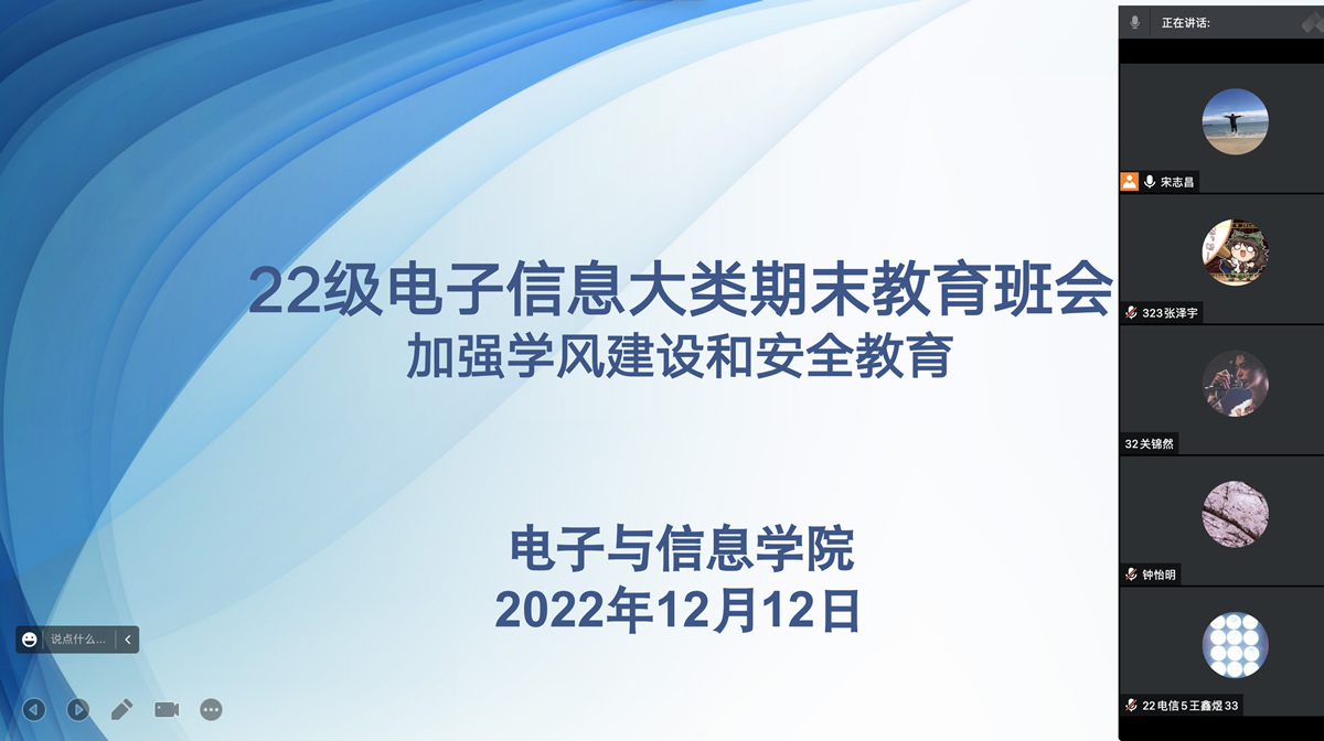 班主任和辅导员分别召开班级期末主题班会,从学风建设、期末考试诚信教育、疫情与健康教育、寒假安全教育四个方面向同学们强调了以下几点:一是希望同学们在期末阶段认真复习备考,努力克服线上教学和考试的困难,鼓励同学们组建学习小组互相监督。同时,倡议班干部和学生党员充分发挥先锋模范作用,密切关注学习困难学生的情况,做好学业帮扶和心理疏导工作;二是希望同学们牢固树立诚信考试理念,并通过多个考试作弊的案例引导同学们遵守考风考纪,积极备考、诚信参考;三是希望学生当好自己健康的“第一责任人”,及时关注和报告自身健康状况,做好个人日常防护。同时,在校同学减少不必要外出和社会面接触,如有不适症状及时就医;四是希望同学们注意假期安全,通过案例警醒同学们在假期注重人身财产安全、交通安全和食品安全,度过一个充实美好的假期。
