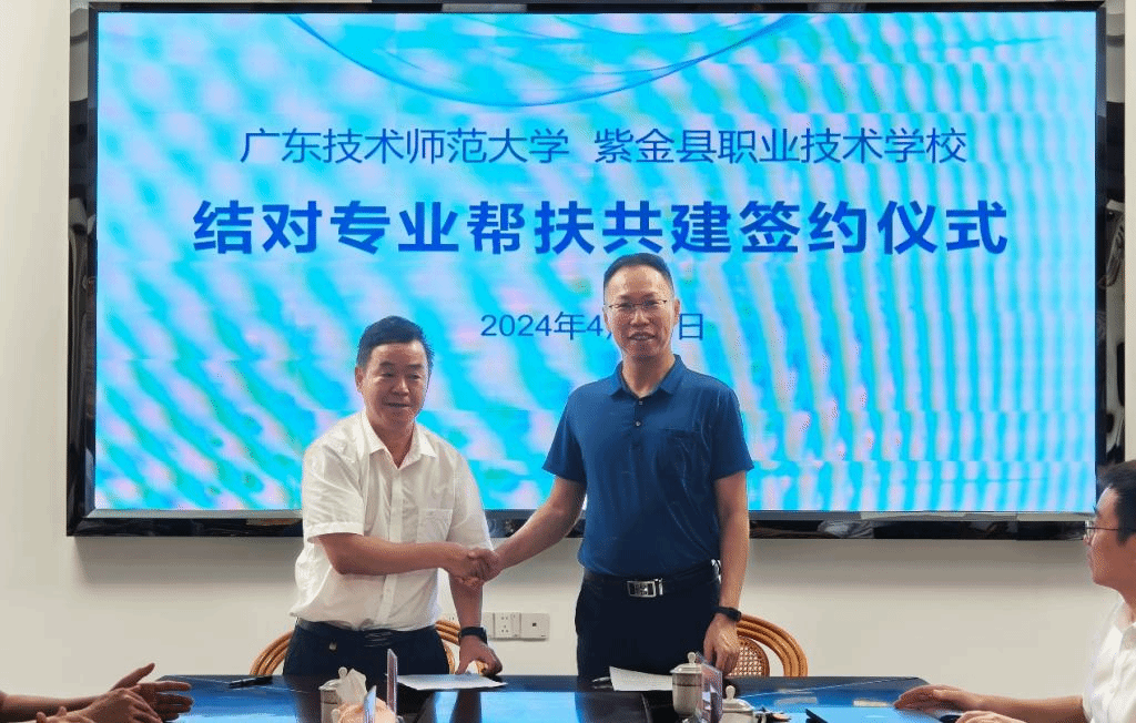 22日,在与河源理工学校的签约仪式上,河源理工学校校长对学校近年来的办学情况进行了介绍。邓文新副校长围绕“量的增长、质的跨越”介绍了我校近年来高速发展的良好态势,对结对帮扶后的合作方向进行了展望。他强调,我们要深入分析传统产业、新兴产业和未来产业的发展和变化,紧紧围绕产业所需、学校所能,展开多层次、多维度的交流合作,让结对专业帮扶变得更宽、更深、更特。期间,双方还共同举行广东省研究生联合培养示范基地揭牌仪式。23日,相关学院负责人与紫金职业技术学校举行座谈会,双方进行结对专业帮扶的签约仪式,并就帮扶工作和帮扶方向展开了深入交流。