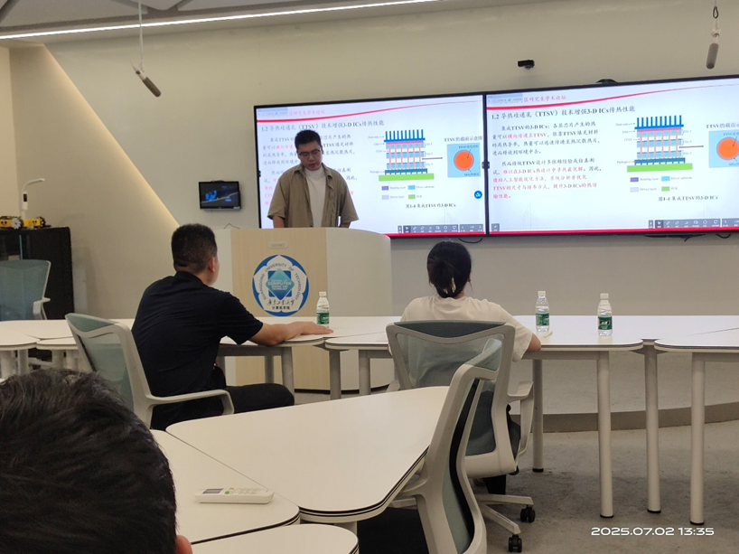 7月2日下午,黄欢同学作了题为《基于三维集成电路的传热性能优化研究》的主题报告。报告中,他深入探讨了三维集成电路在热管理方面所面临的复杂挑战,特别是在高密度封装和多层芯片堆叠结构下,如何有效解决芯片内部热积聚引起的热失控问题。黄欢同学介绍了通过引入人工智能优化方法的创新研究思路,重点分析了如何通过AI对系统进行整体结构优化来实现三维集成电路的高效热设计,为三维集成电路的散热性能优化提供了创新性思路。